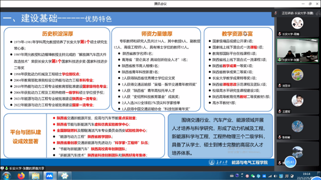 专家组认真听取了学科建设方案汇报并进行了线上质询,经过充分讨论后认为,长安大学动力工程及工程热物理学科定位符合目前能源动力科技的发展趋势和国家“交通强国”、“双碳”战略目标,学科建设方案合理可行,发展目标明确、建设任务清晰、建设内容具体。学科建设预期成果和考核指标科学合理,对促进学科内涵建设、开拓学科发展格局、提升学科建设水平具有重要意义。同时,专家组也从进一步凝练学科建设特色、明确与对标高校的比对内容、突出学科对学校第二轮“双一流”整体建设方案的支撑作用等方面,对学科建设方案提出了改进意见与建议。