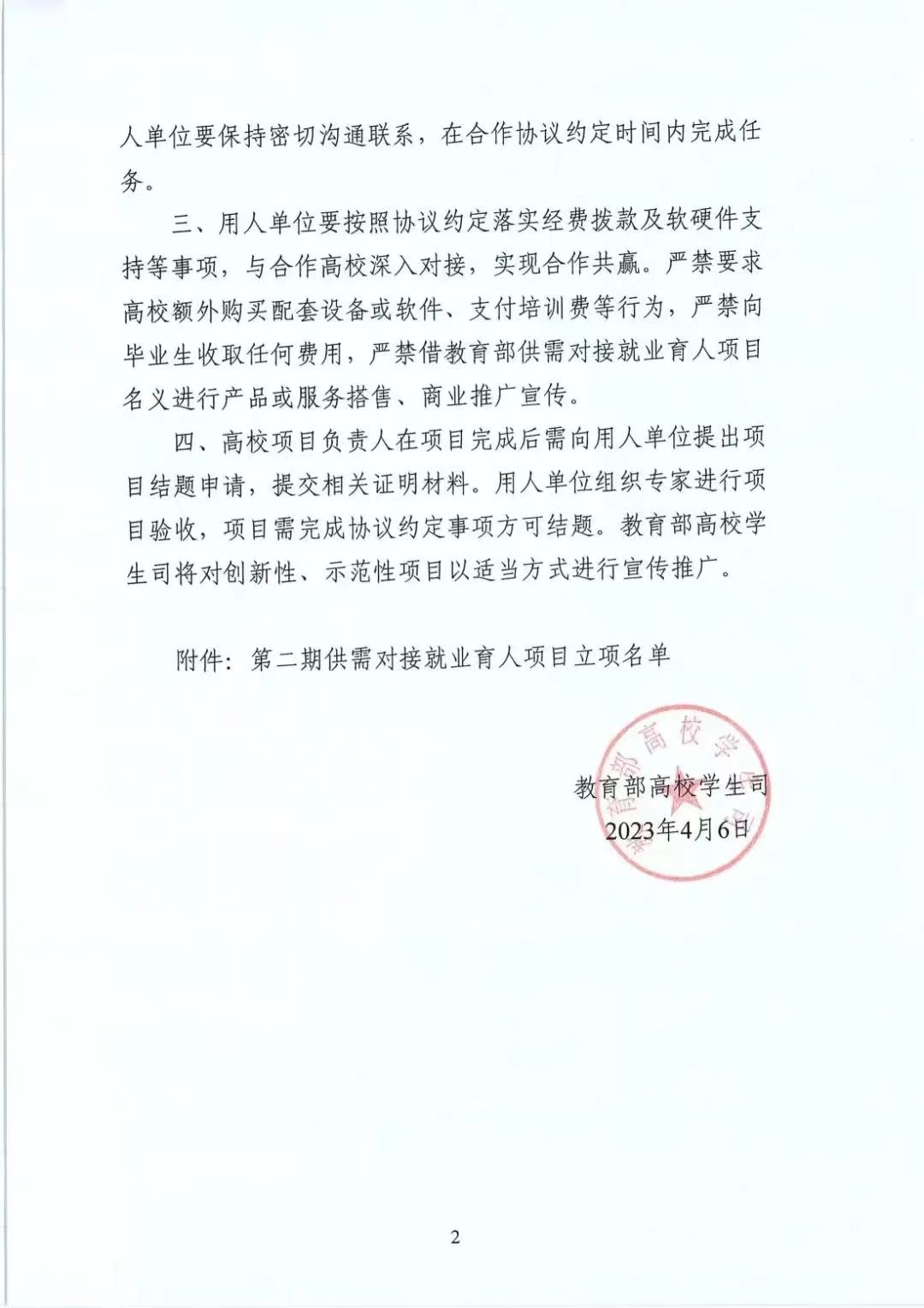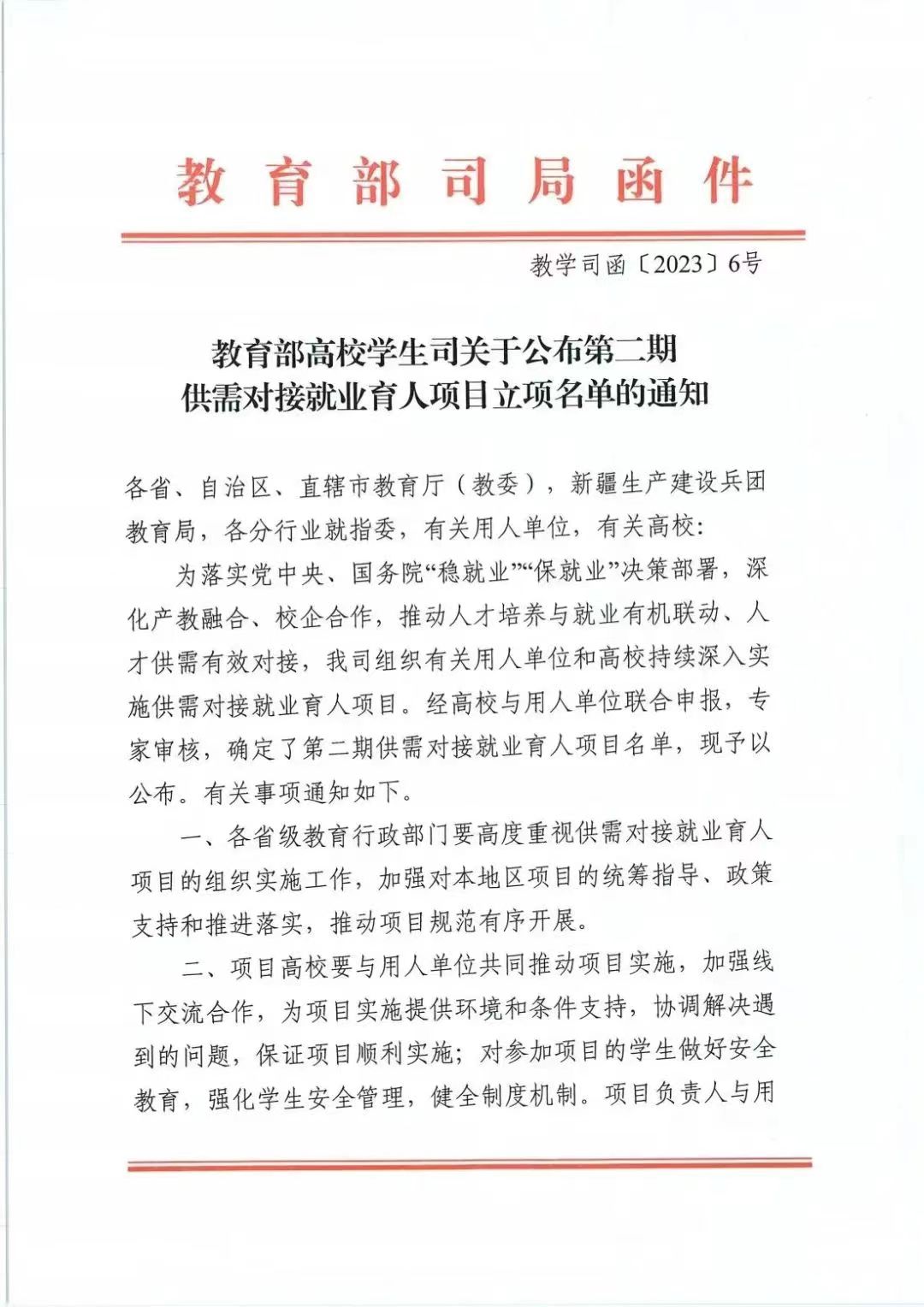 自2021年起,为深入贯彻落实党中央、国务院“稳就业”“保就业”决策部署,深化产教融合、校企合作,推动人才培养与就业有机联动、人才供需有效对接,教育部供需对接就业育人项目启动实施。通过开展定向人才培养、建立就业实习基地、实施人力资源提升和加强重点领域校企合作,广泛搭建校企合作平台,大力拓展学生就业渠道,实现校企互利共赢、共同发展。