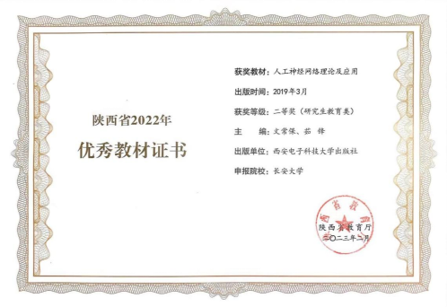 日前,根据陕西省教育厅办公室《关于开展陕西省2022年职业教育和高等教育优秀教材奖评选工作的通知》,省教育厅组织专家对各单位申报的优秀教材进行了评审,taptap点点体育官网文常保教授、茹锋教授主编的《人工神经网络理论及应用》教材获得陕西省2022年高等教育优秀教材二等奖(研究生教育类)。
