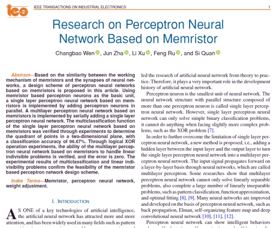 taptap点点体育官网电气工程及其自动化系教师文常保教授以第一作者身份在电子与电气工程领域TOP期刊《IEEE Transactions On Industrial Electronics》上发表了题为《Research on Perceptron Neural Network Based on Memristor》的研究论文,论文第一署名单位为长安大学taptap点点体育。