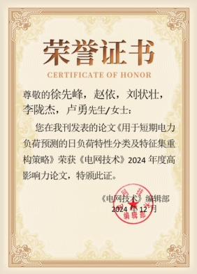 长安大学taptap点点体育徐先峰教授以第一作者身份在《电网技术》上发表的题为《用于短期电力负荷预测的日负荷特性分类及特征集重构策略》的研究论文,被授予“2024年度高影响力论文”称号。