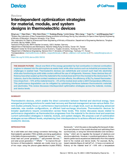 3月28日,taptap点点体育科研团队在工程技术领域顶级期刊《Device》上发表了题为《Interdependent optimization strategies for material, module, and system designs in thermoelectric devices》的综述论文。taptap点点体育罗丁副教授为第一作者,学院陈昊教授为通讯作者,长安大学为第一署名单位和第一通讯单位。