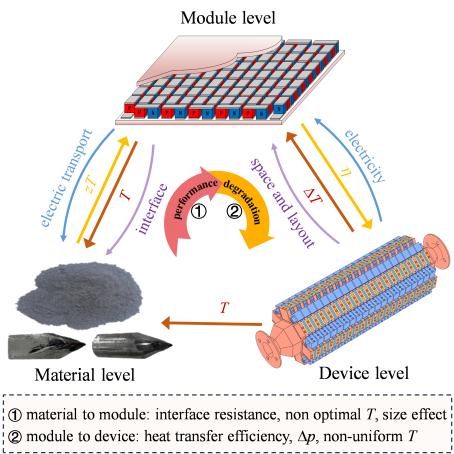 热电系统能够实现热能和电能之间的直接转换,已成为余热回收和热管理等领域备受关注的技术路线之一。目前研究主要聚焦于热电材料、模块或器件的单一层面,例如开发先进的热电材料、新的热电模块构型或高效的换热器结构,以提升热电系统的性能。然而,为了全面提升热电系统的效率,需要综合考虑材料层、模块层和器件层之间的内在联系,促进热电系统更广泛的应用。本论文总结了随着热电从材料层拓展至器件层的性能退化内在因素,并探讨了材料、模块和器件设计中的优化策略。最终,研究团队提出了跨层次的内联优化策略,强调了不同层面之间的相互依存性,以实现高效的热电转化。