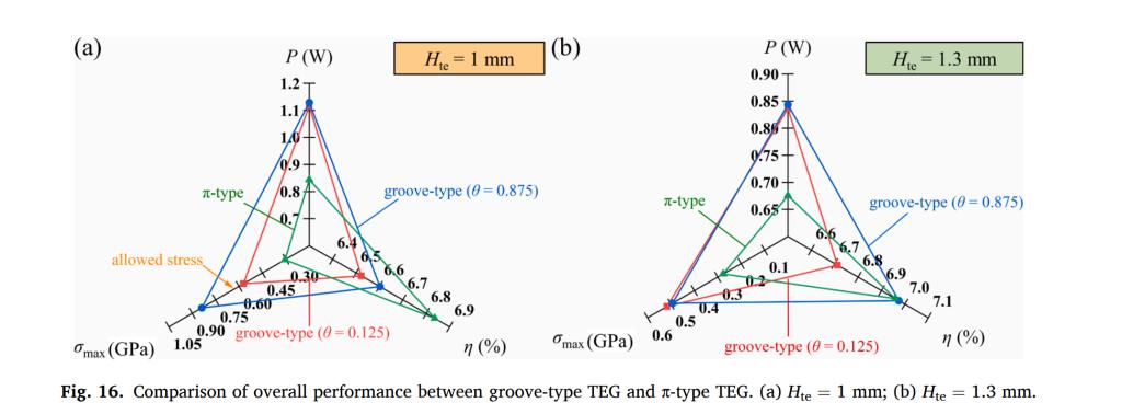论文提出了一种新型的沟槽型热电发电机(TEG),通过在热电半导体与导电条之间引入三角形支架以增加接触面积,从而优化内部热传递性能。通过建立热-电-力多物理场数值模型,分析了沟槽长度、高度、高度比以及温度差和半导体高度等参数对TEG性能的影响。结果表明,增加沟槽的长度和高度可以有效提升输出功率,但总沟槽高度需低于热电半导体的高度以避免性能下降。沟槽高度比对性能影响显著,当高度比为0.875时,输出功率最高(1.13 W),但需考虑热应力限制。在热端温度为500 K、半导体高度为1.3 mm时,沟槽型TEG的输出功率和转换效率分别达到0.84 W和6.9%,较传统π型TEG提升了24.8%和0.2%。此外,研究还发现,热应力随温度差和高度比增加而上升,需综合考虑机械稳定性。最终,论文确定了在不同半导体高度下的最优高度比(0.125或0.875),为TEG的综合性能优化提供了新思路。