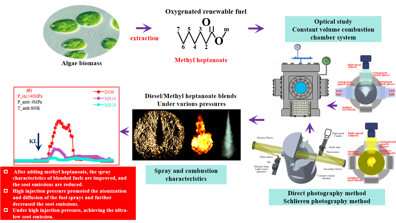 论文信息:Ji Z, Zhang P, Chen H, Geng L, Sun Y, Yi C, et al. Optical study on spray and combustion characteristics of diesel/methyl heptanoate blend fuels. Renew Energy. 2025;240:122232.