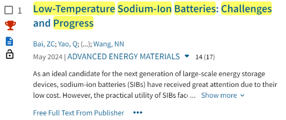 长安大学taptap点点体育孟伟嘉博士以第一通讯作者身份发表在《Advanced Energy Materials》上的题为《Low-Temperature Sodium-Ion Batteries: Challenges and Progress》的研究论文,入选ESI高被引论文,被引频次排名前1%,该论文正式发表于2024年5月,目前被引用100余次。