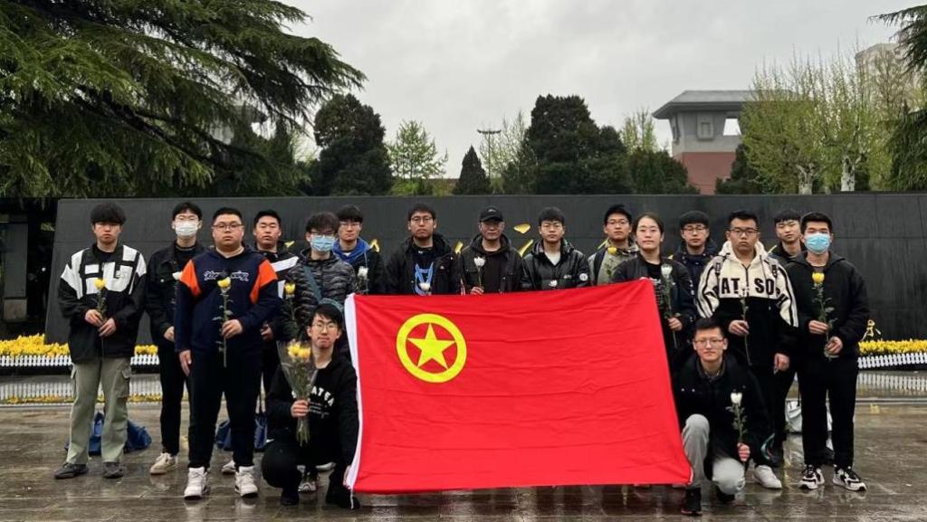 上午9时,我们在蒙蒙细雨中于烈士陵园南门列队进入并展开团旗,在刻有“人民英雄永垂不朽”的石雕前手持菊花合影。