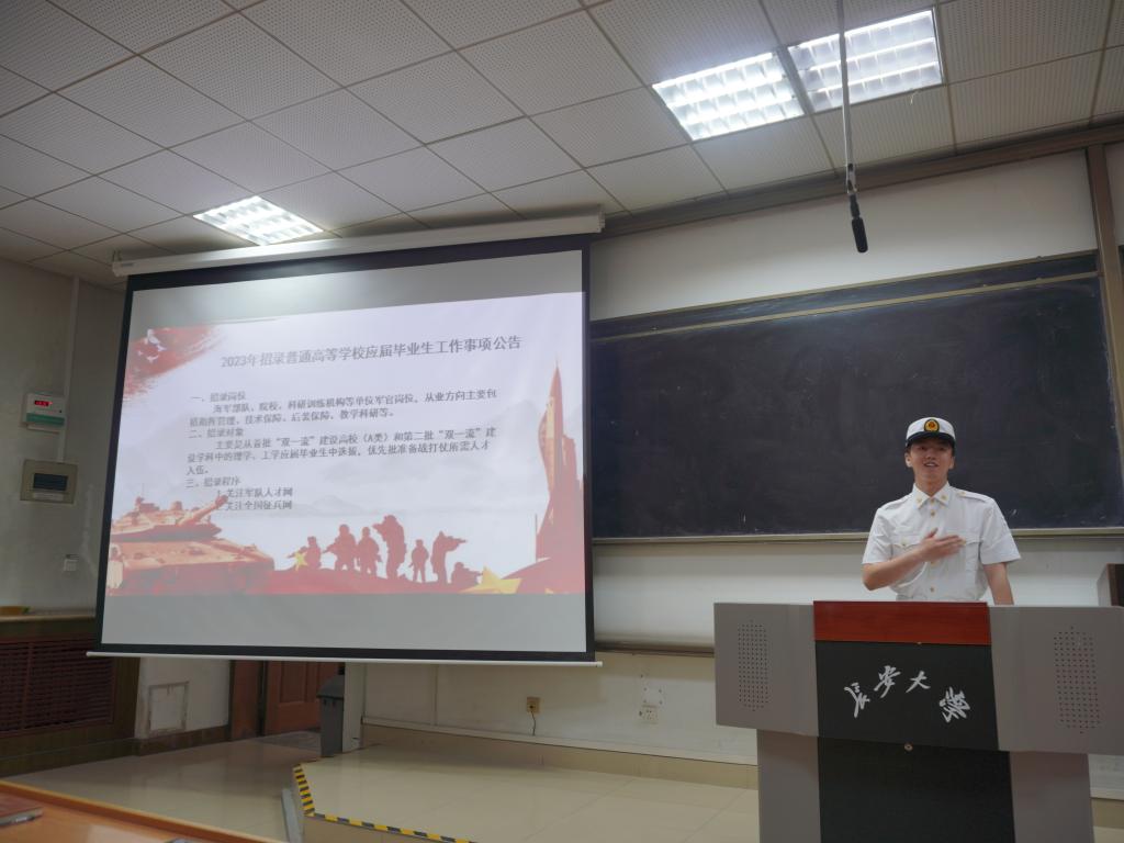 恰逢中国人民解放军海军建军74周年,王杰向同学们介绍了海军的基本情况,回顾了自己两年军旅生涯的点点滴滴和自身感悟,并号召同学们踊跃参军,报效祖国。“清澈的爱,只为中国”、“光荣在于平淡,艰巨在漫长”这是王杰对于军旅生活的感悟,这两句话也被在场师生深深记在心底。