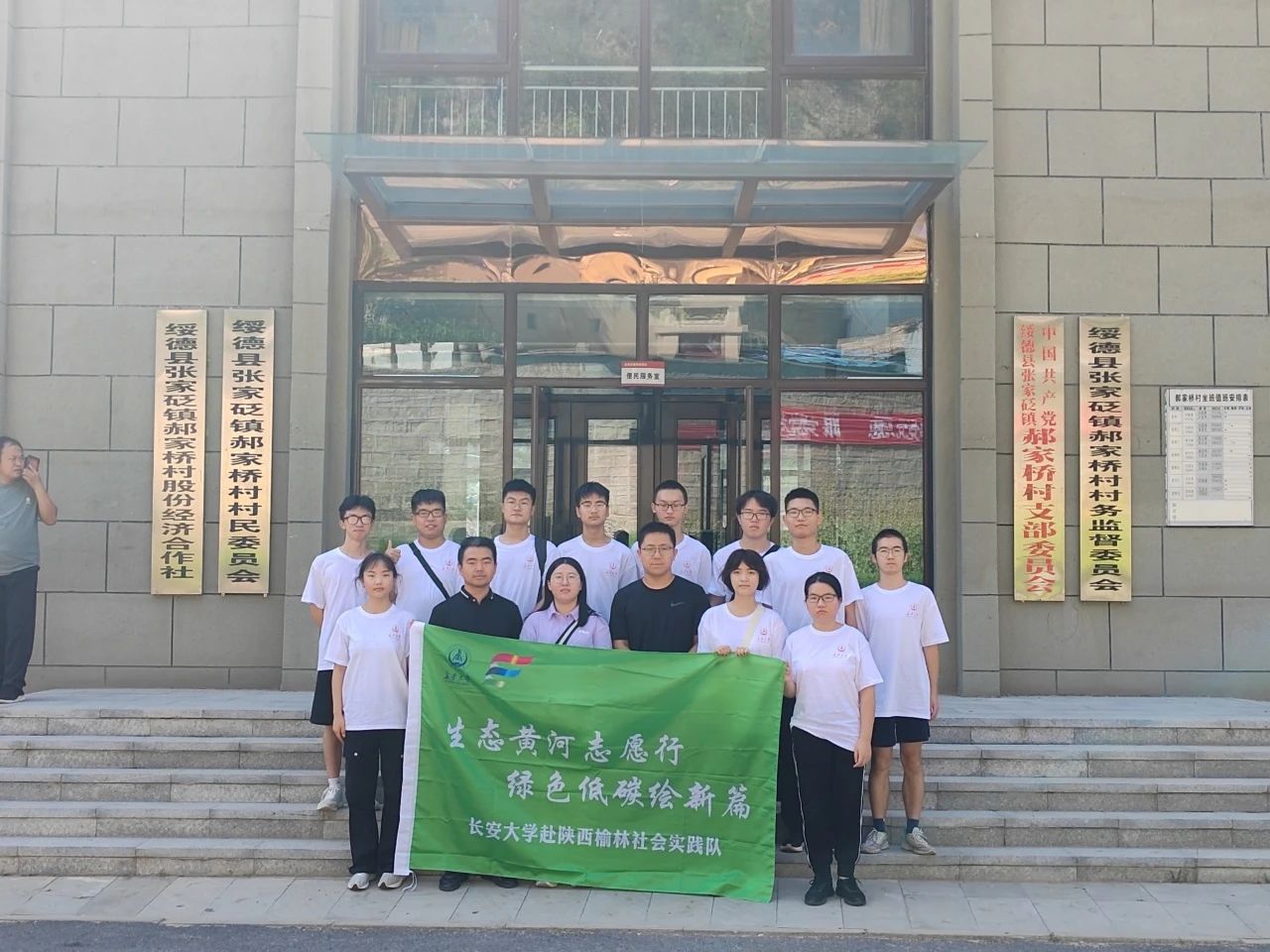 接着,实践队员前往“郝家桥村互助幸福院”,张家砭镇副镇长王应伟与队员讲述了当年习近平总书记在幸福院门口与村民亲切交流的难忘记忆,以及如今郝家桥村的建设发展情况。远处的山坡上, “绿水青山就是金山银山”的字牌赫然醒目。