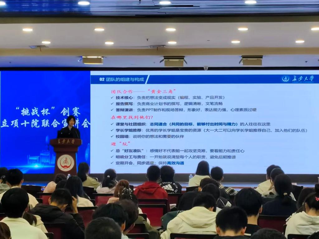 为进一步提升学生创新实践素养,点燃学生对科技创新的探索热情,充分调动学生参与科创赛事的主动性,2025年10月11日,taptap点点体育、电控学院、汽车学院、机械学院、信息学院、资源学院、理学院、人文学院、水环学院、外国语学院十院联合举办的长安大学2025年“挑战杯”大学生创业计划竞赛十院联合宣讲会于长安文化艺术中心三楼多功能厅成功开展。本次宣讲会邀请了往届“挑战杯”竞赛的优秀团队代表分享他们的经验和心得,为参赛者提供详尽的赛事信息和宝贵的参赛经验。