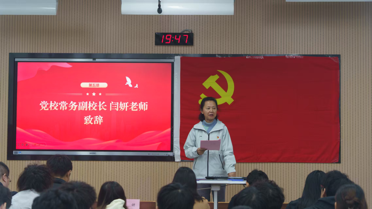 闫妍在致辞中向参加培训的69名学员表示祝贺,对学院发展党员培训工作给予了充分肯定与高度评价。她对全体学员提出了四点希望与要求:一是要坚定理想信念,铸牢思想根基;二是要加强理论武装,提高党性修养;三是要厚植家国情怀,挺膺担当时代责任;四是要坚持知行合一,发挥先锋模范作用。