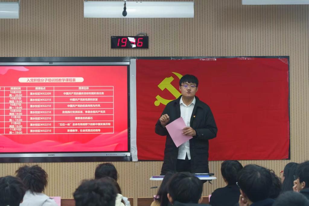 王霄宣读了入党积极分子培训班教学计划和学员考核及学习纪律规定,希望同学们严格遵守相关规定,认真学习党课内容,确保学习成效。杨仝泽作为学员代表进行了发言,表达了自己对本次党课学习的态度和决心,将以更高的标准严格要求自己,争取早日加入。