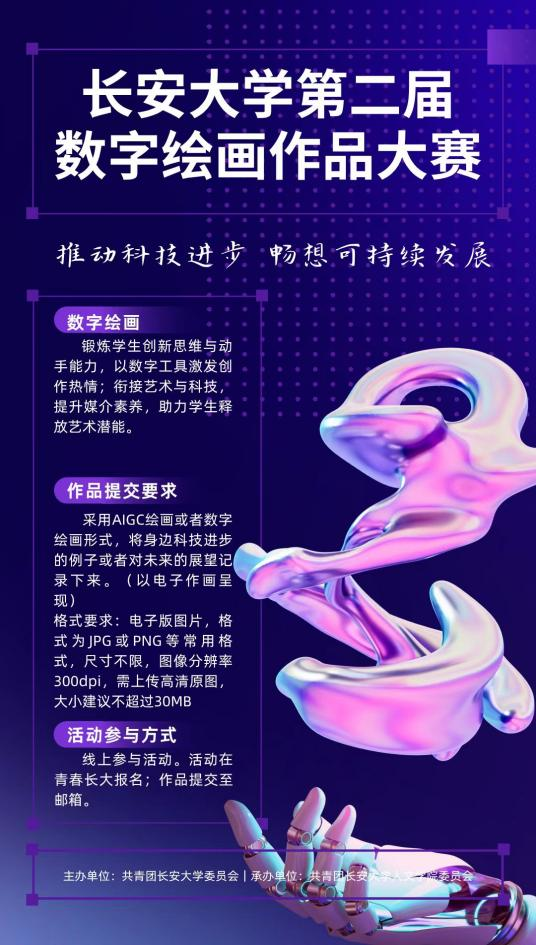 为深入学习宣传贯彻习近平新时代中国特色社会主义思想,营造浓厚的校园创新创业文化氛围,人文学院科协特此举办“推动科技进步,畅想可持续发展”长安大学第二届数字绘画大赛。在当今世界,可持续发展已经成为全球关注的焦点。同时,科技创新是推动社会进步和可持续发展的重要驱动力。我们可以采取不同的形式将身边的例子和对未来的展望记录下来,本次活动分为两个赛道“数字绘画”和“AIGC绘画”,用数字绘画和AIGC技术来记录科技带给自己和身边其他人和事的变化以及对未来的展望。旨在以多种多样的形式让大家更加直观地感受到科技创新对可持续发展带来的变化和贡献,深刻体会到科技强大的力量。同学们可以在青春长大报名后,以群聊或邮箱的方式收集参与者的作品,并在公众号上发表展示。在活动结束后,我们将给参与者发放获奖证明。