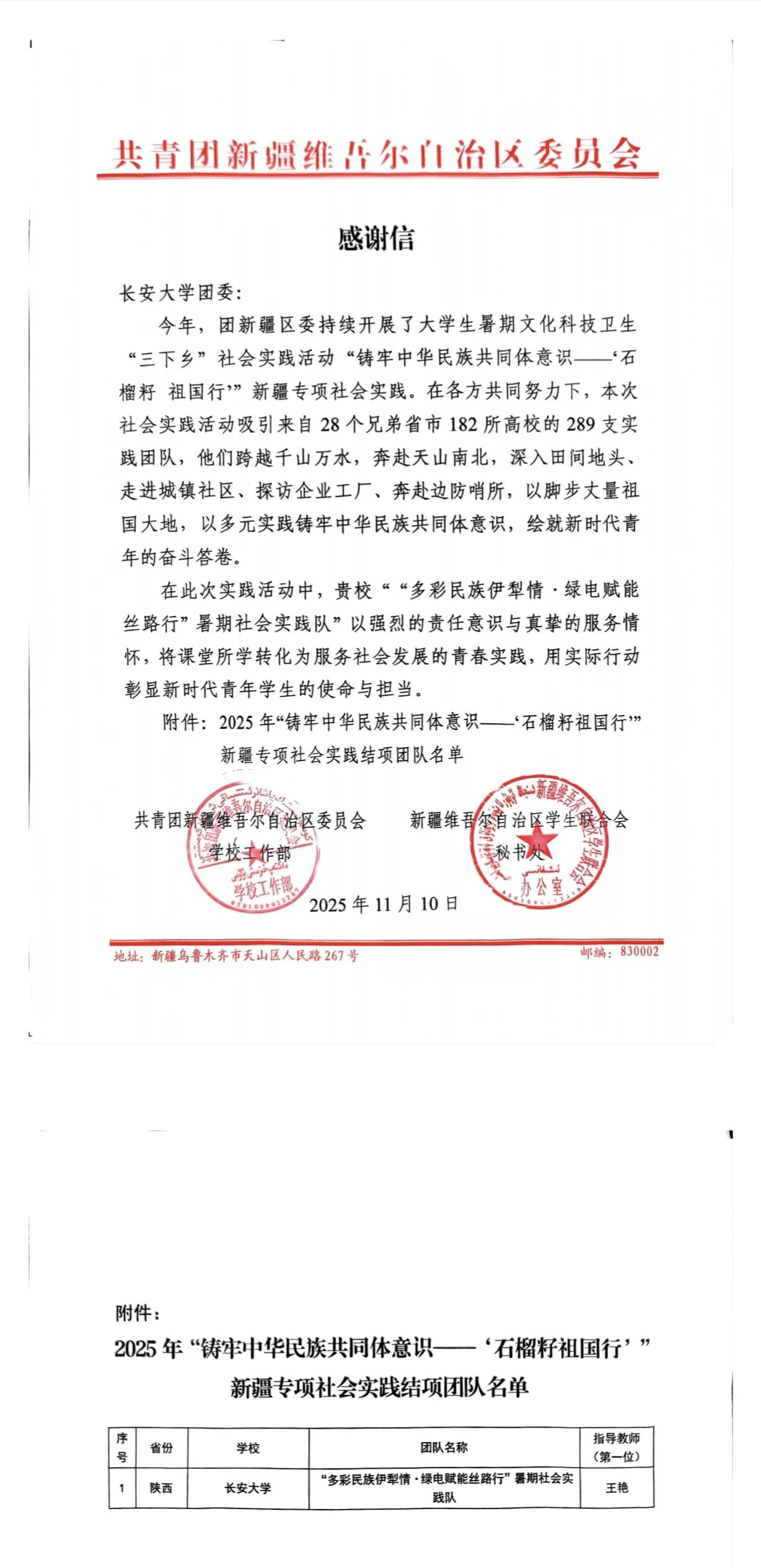 近日,共青团新疆维吾尔自治区委员会向taptap点点体育官网实践队发来感谢信,对taptap点点体育官网“多彩民族伊犁情·绿电赋能丝路行”社会实践队在2025年大学生暑期文化科技卫生“三下乡”社会实践活动“铸牢中华民族共同体意识—‘石榴籽 祖国行’”新疆专项社会实践中作出的积极贡献予以表扬和感谢!