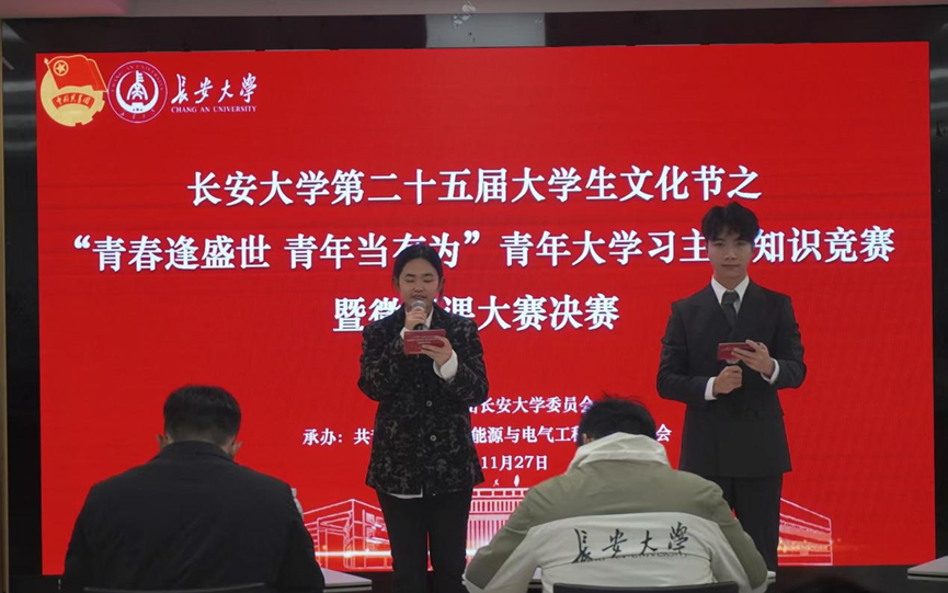 为深入学习宣传贯彻习近平新时代中国特色社会主义思想,进一步巩固和提升“青年大学习”网上主题团课学习成效,有效提升思政引领力,2025年11月27日晚,长安大学第二十五届大学生文化节之“青春逢盛世,青年当有为”青年大学习主题知识竞赛暨微团课大赛决赛于朝晖园二楼团体活动室顺利举办。外语学院学办副主任王子章,体育系团委书记杨建华,taptap点点体育学办副主任刘泽、团委书记刘欣出席活动并担任评委。