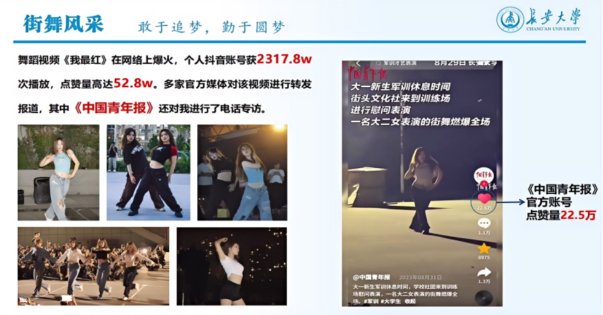 除了参加比赛,王睿涵还积极服务学校大型活动,在长安大学第十七届阳光体育运动会街舞比赛中,王睿涵率领学校街舞队队长对全校20支参赛队伍进行动作指导,极大地提升了该项赛事的专业水准。在第十四届“挑战杯”陕西省大学生课外科技作品竞赛闭幕式和长安大学庆祝新中国成立75周年暨2024年迎新生文艺晚会上,王睿涵作为主要负责人表演《强国有我》《活力校园》。