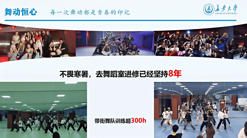 经过日复一日的刻苦训练,长安大学街舞队已经成为一支训练有素的队伍,在首届中国大学生街舞锦标赛的赛场上,王睿涵带领长安大学街舞队顶住压力,最终获得了甲组Hip-hop套路第七名、Jazz套路第八名的优异成绩。