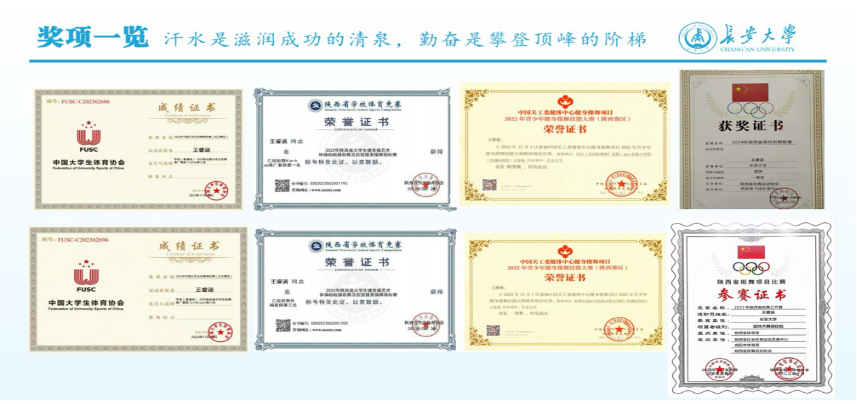 2023年6月,面对即将到来的陕西省大学生健美操艺术体操啦啦操街舞及校园健身操舞锦标赛,作为新任的长安大学街舞队队长,王睿涵带领学校街舞队刻苦排练,最终获得此次锦标赛Hip-hop套路第一名,同时还斩获了锦标赛自编套路第三名的好成绩。此后在她的带领下,长安大学街舞队陆续斩获了2023年陕西省街舞公开赛团体齐舞(高校组)二等奖、2024年陕西省街舞公开赛亚军等省级奖项。