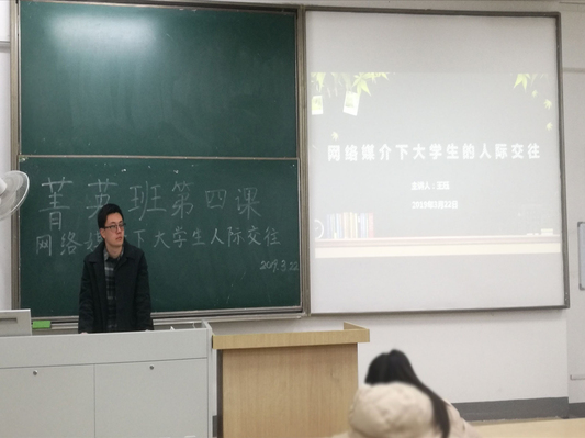 2019年3月22日晚,188BET金宝搏官网第三十四期大学生菁英人才学校暨188BET金宝搏官网学生骨干培训班第四课在教3-303教室开展。本次课程由188BET金宝搏官网2018级辅导员王珏老师主讲,主题为《网络媒介下大学生的人际交往》。